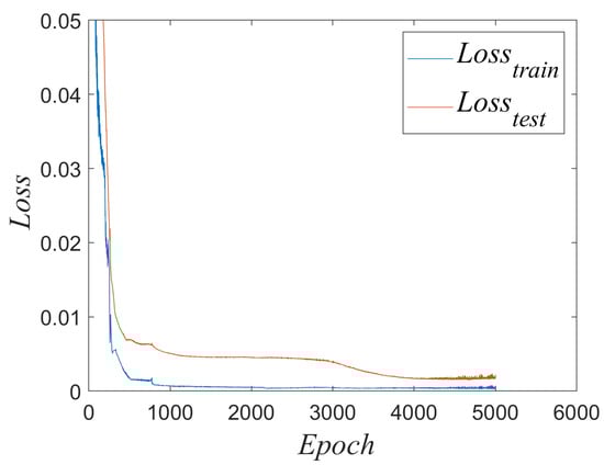 The MLP model is trained by the Adam optimizer, with an initial learning rate of 0.001 and a decay rate of 1/2 every 1000 epochs. The total training process has 5000 epochs. The batch size is 64. The loss function drop curves are shown in Figure 21.