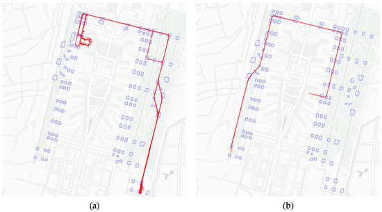 History taxi trajectories from the same runway–gate pair: (a) eight alternate routes from runway 02R to gate 142; (b) only one route from runway 01 to gate 139.