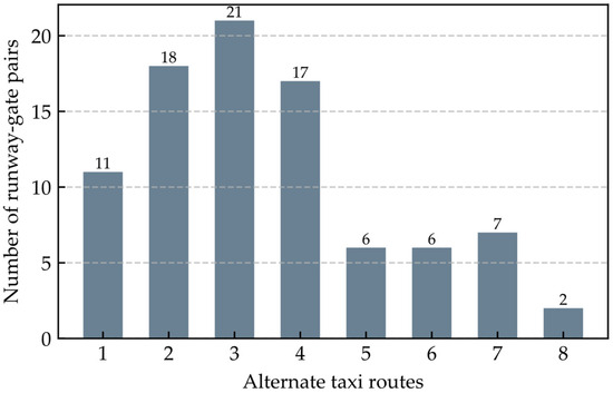 Figure 2 gives an example of alternate taxi route options, in which Figure 2a shows eight options from runway 02R to gate 142, and Figure 2b shows only one option route from runway 01 to gate 139. The alternate route options are summarized in Figure 3, in which 88 pairs are recognized, and most pairs have 2~4 options to taxi.