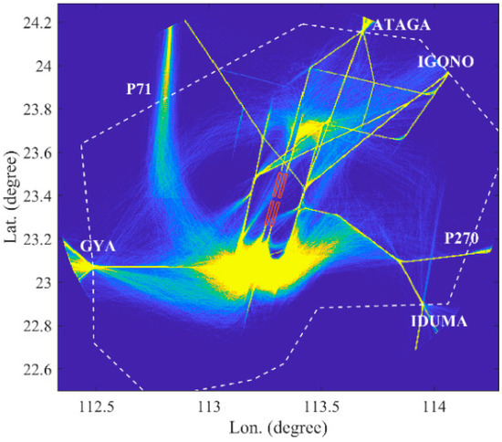 Second, before discussing on flight time distribution, we would like to address how EFs and runways are configured. ZGGG has three runways, namely the west runway 01 (RWY01), the east inner runway 02L (RWY02L), and the east outer runway 02R (RWY02R). The west runway is typically used for takeoff and landing in a mixed operation mode. The east runways are closely spaced parallel runways used for takeoff (RWY02L) and landing (RWY02R) in a segregated operation mode. The TMA has six entry fixes, namely ATAGA, IGONO, P270, IDUMA, GYA, and P71, as shown in Figure 4. Only three out of five EFs have STARs to both runways, namely P71, ATAGA, and IGONO, while arrivals from GYA are regulated to land on RWY01 and P270, IDUMA to RWY02R.