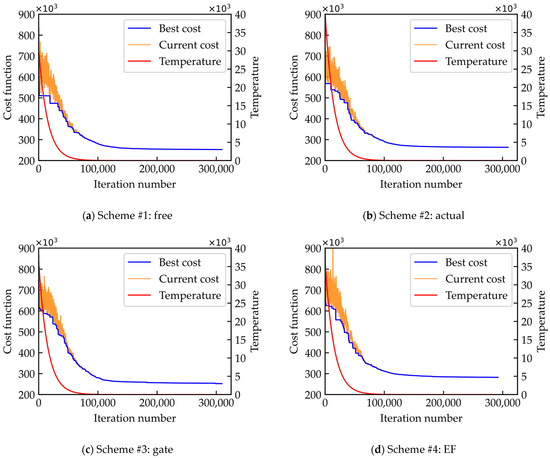 As shown in Figure 6, all four schemes converge gradually after 300,000 iterations; the first approximately 75,000 iterations focus on exploration, and the subsequent iterations mainly concentrate on exploiting the best solution. Through the four schemes, we could find four schemes have a different initial temperature (red line), as we adopted a dynamic initial temperature scheme, which was determined by the difference of several initial neighborhood costs.