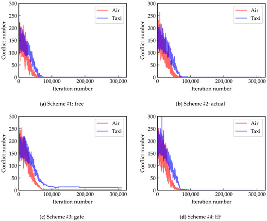 Figure 7 gives conflicts of the four schemes, in which blue lines represent conflicts in taxiways while red lines represent conflicts in TMA. The iterations number used to find a conflict-free solution are different. Scheme #1 found the conflict-free solution in the first 75,000 iterations, while schemes #2 and #4 needed more than 10,000 iterations. However, for scheme #3, the algorithm failed to find a conflict-free solution. This could be attributed to too many aircraft being assigned to one specific side of the runway according to the configuration of the gates, resulting in an unbalance of the total runway resources.