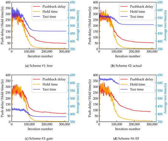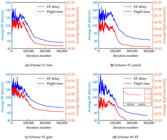 Figure 8 shows the flight time and delay at EF of arrivals. All four schemes converged after the iterations finished. Scheme #4 led to the shortest flight time (1167.1 s) among the four schemes since scheme #4 used a runway close to the EF of each arrival aircraft. Correspondingly, using a runway close to gates (Figure 8c) would increase the average flight time by 22 s (to 1189.9 s).