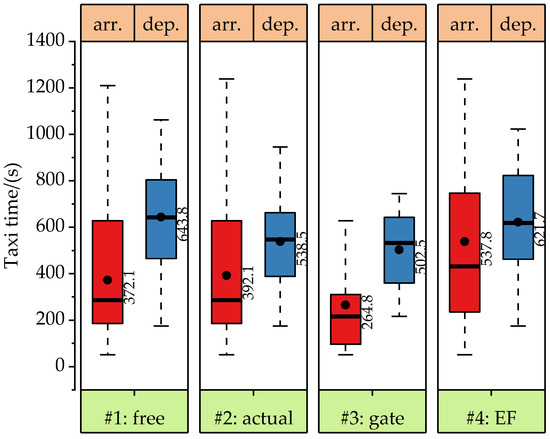 Figure 5a shows the flight time distribution of arrival aircraft. From the boxplot of the middle three EFs that can change runways, we can find that the time distribution and average flight time are similar, with the highest difference in IGONO no more than 80 s, which provides a possibility to assign arrivals on another runway to improve the surface movement at the cost of increasing just a little flight time.