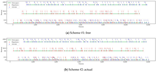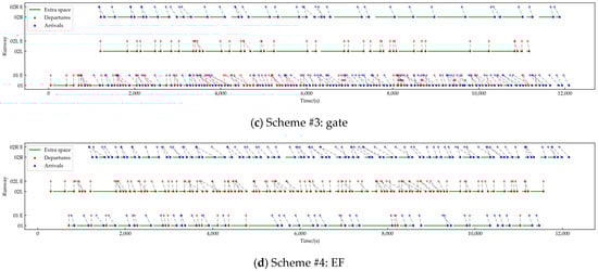 This study chooses a busy time in the ZGGG terminal, from 1600 to 1900 UTC+8, on 3 December 2019, to carry out optimizations. Based on the former analysis, four schemes are studied in this case: runways are assigned freely, according to the actual, close to the gate, and close to the entry fix, respectively. For simplicity of explanation, the four schemes are indexed and named after its rule of assigning runways: scheme #1: free, scheme #2: actual, scheme #3: gate, and scheme #4: EF.