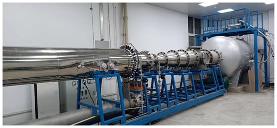 The investigation was conducted in the Mach 6 Ludwieg wind tunnel at Huazhong University of Science and Technology (HUST), which has an experimental section with an aperture of 0.5 m (as shown in Figure 1). The wind tunnel uses air as the working fluid and can be operated continuously for 100 ms. Since the operating time is sufficiently short, the walls of the test model maintain an ambient temperature of 300 K during the test time unless active wall heating is employed. The effective total pressure range of the wind tunnel is 0.5~3 MPa, and the total temperature can reach up to 650 K. This experiment was conducted at a freestream Mach number of 6 and a Reynolds number of 1.08 × 107 m−1. Detailed experimental conditions are presented in Table 1.