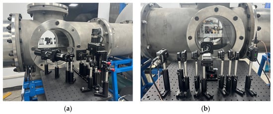 Photograph of the 2P-CFLDI system setup at the HUST Ludwieg wind tunnel: (a) transmit side; (b) receive side.