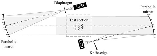 A conventional Z-type parallel Schlieren technique was employed to visualize the flow density gradient (as shown in Figure 6). Illumination was provided by an HPP-120 g high-power, high-speed strobe LED light source. To manipulate the light beam, two parabolic mirrors with a diameter of 0.2 m and a focal length of 4 m were positioned. The first mirror collimated the light from the LED, ensuring parallel rays, and the second mirror refocused the collimated light toward the camera. At the refocusing position, a knife-edge cutoff was introduced to enhance the sensitivity, allowing visualization of subtle density gradients on the flat surface. An IDT NX4-S3 high-speed camera was mounted parallel to the flat surface and recorded the images. Throughout the experiments, the minimum flash time of the LED was 1 µs, and the camera sampled at a frame rate of 6000 fps.