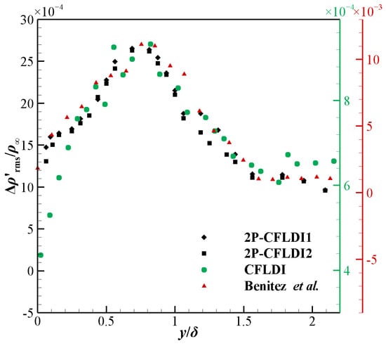 In Figure 7, the root mean square (rms) of density gradient fluctuations (normalized by using freestream density) is presented along the wall-normal direction at x = 410 mm. The wall-normal distance is normalized to the boundary layer thickness measured using Schlieren imaging (see Section 4.1 for specific measurement details). To facilitate a more intuitive comparison of density gradient fluctuations under different experimental conditions, different ranges of axes were used for the vertical coordinate. Figure 7 displays the results obtained for each channel of the current 2P-CFLDI system using black square symbols. The previous CFLDI results [31] are represented by green circle symbols, while the numerical results calculated by Benitez et al. [33,34] are depicted using red triangle symbols. Not surprisingly, the 2P-CFLDI system (Δ ≈ 0.0715 mm) yielded consistent results for two optical paths split along the flow direction by a large separation angle Wollaston prism (W0). The measured density gradient fluctuation intensity followed the expected trend. Notably, as the separation distance Δ increased, the amplitude of density gradient fluctuations also grew, eventually approaching the amplitude of density fluctuations. It is essential to acknowledge that the absolute amplitude difference may arise from the bandwidth of the density fluctuations. At small separation distances Δ, the CFLDI system cannot fully capture the amplitude of large wavelength disturbances, leading to a loss of energy. A similar phenomenon was observed by Parziale [35] when quantifying freestream density fluctuations in a T5 reflective shock tunnel, where corrective measures were applied to refine the measurement results.