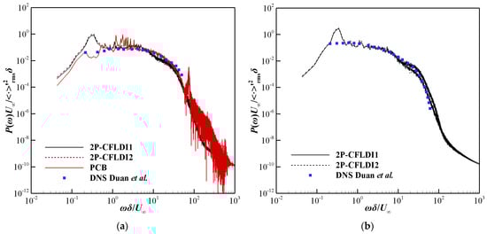Normalized frequency spectrum of PCB and CFLDI signals at measurement location on the wall. Compared with the DNS result of turbulent boundary layer: (a) wall; (b) freestream [37].
