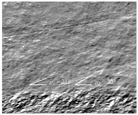To better visualize the turbulent boundary layer disturbance noise radiation, the average grey map of all images taken during the steady operation of the wind tunnel is selected as the reference image. The grey value of each frame during the experiment is subtracted from the grey value of the corresponding position in the reference image, which results in a different image that highlights the regions where the noise radiation is stronger or weaker than the background level. In addition, the contrast of all images was likewise enhanced to improve the visibility of the noise features by stretching the range of the grey values. The final obtained image is shown in Figure 10. It depicts the distribution of the radiation angle of the disturbance structure at a certain moment. The noise radiation angles obtained by Duan et al. through numerical Schlieren [37] and plane–acoustic wave relations [38] are μ1 = 21° and μ2 = 30°, respectively. The Schlieren image obtained in this experiment shows that the far-field noise radiation angle is closer to 21°, and the angle increases at the position close to the boundary layer edge.