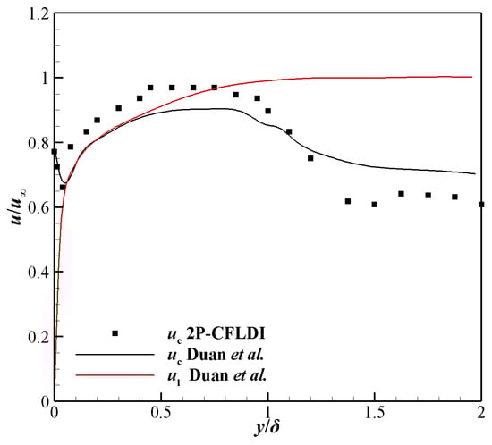 Figure 12 compares convective velocities at the wall and in the freestream with some of the available experimental and simulation results. On the wall, the convective velocities measured using 2P-CFLDI are slightly lower than the DNS results from Duan et al. [37] while higher than the trend of the experimental results from Kistler and Chen [42]. This discrepancy may be due to the fact that it was not possible to ensure that the measurement position was completely on the wall during the experiments (there was still some slight distance from the wall). In the freestream, the convective velocity measured using 2P-CFLDI matches the trend of the experimental data from Laufer [40] but is significantly lower than that of the DNS results from Duan et al. [37]. This discrepancy may be due to the difference in the method used to calculate the convective velocity between the experimental and numerical means. In Figure 12b, Mr = (u∞ − uc)/a∞ (a∞ denotes the speed of sound in the freestream condition), and the area below the black solid line Mr = 1 (i.e., the area where Mr > 1) is associated with supersonic convective disturbance relative to the freestream. The convective velocities measured in this study are within this region, indicating that the disturbance structure convects supersonically to the freestream and generates noise radiation. This phenomenon is consistent with the concept of “Eddy Mach wave radiation” in supersonic flows. The ability of 2P-CFLDI to measure convective velocities is further validated.