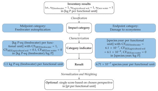Steps during the impact assessment phase on the example of Phosphorus (P), adapted from [13] and [4] (Figure 3 in [4]); xP,freshwater stands for the amount of P emitted in freshwater.