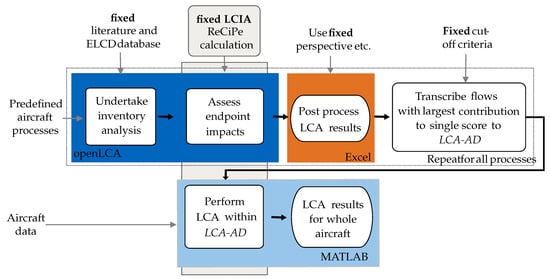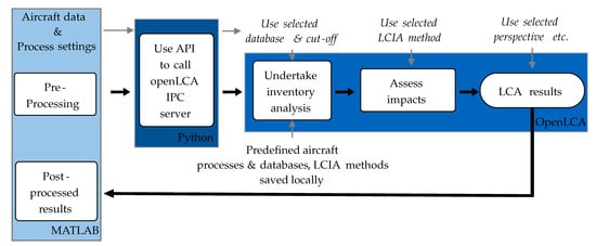 The methodology of the advanced tool openLCA-AD is outlined in Figure 4, showing that the overall assessment is performed in openLCA. For that, inputs are set firstly in MATLAB, such as the selected assessment method and assumptions (e.g., ReCiPe (2016) hierarchist and region world), the aircraft-specific data (e.g., aircraft’s maximum take-off weight), as well as additional data pre-processing (e.g., estimating turn-around time based on aircraft type). With the input data, a Python script is called, which includes the olca-ipc package [49] providing an API for inter-process communication with openLCA. With that, all modeled processes (from the development to the reuse phase) can be calculated at once with different LCIA and perspectives. After the simulation exports the results, the data are post-processed. The quantitative metrics presented in Section 3 are either read in (e.g., results of midpoint and endpoint categories) or require additional calculation (e.g., assessing specific LCI).