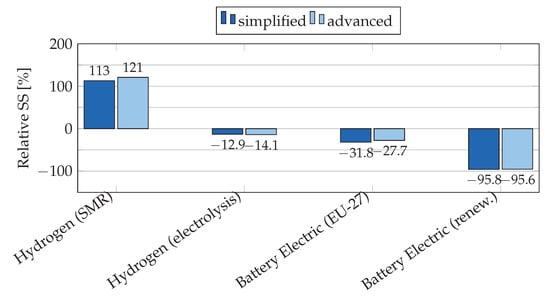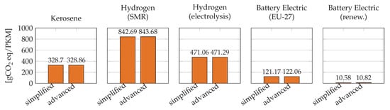 The initial metric under consideration is the single score (SS), as illustrated in Figure 5. This figure displays the relative differences in SS between the kerosene-powered aircraft and its alternatives using both the simplified and advanced tools. The findings indicate that the methodologies exert a negligible difference on the single score. The SS impact ranges from for the hydrogen-powered aircraft concept with generated by electrolysis, to for the same concept with hydrogen generated by steam methane reforming. The reason lies, for one, in the reduced number of considered in- and outputs of the simplified tool as explained in Section 2.4. For example, the input “hard coal” was neglected in the process “energy carrier production” which was considered per 1 MJ energy or kg fuel. Multiplying the resource with the actual energy amount, the considered resource increases by a factor of (see also reduced numbers in Table A4 and detailed explanation in the Appendix B.2). For another, in- and outputs are neglected in the simplified tool if the characterization factor of the sub-compartment is small. For example, for the emission “phosphate” (), only “emission to air” (and not “to soil”) is considered. Overall, this leads to an increased SS for all configurations assessed by the advanced tool when comparing it with the simplified one (see Table A5, Table A6, Table A7 and Table A8).