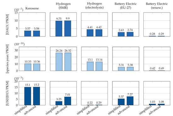 Results of life cycle impact assessment (simplified (bugfixed) vs. advanced LCA) of the battery-electric aircraft (renewable energies).