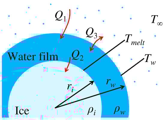 Figure 1 shows the schematics of the ice crystal model for a partially melted state during flight, composed of spherical ice of radius and a surrounding water film of external surface radius ; the interface temperature between ice and water film is consistent with the melting temperature of ice . We considered three heat transfers between the interfaces: , , and . Here, represents the heat received from the surrounding air, represents the heat transferred into the ice from the water film, and represents the heat of evaporation or condensation [35] on the outer water film surface.