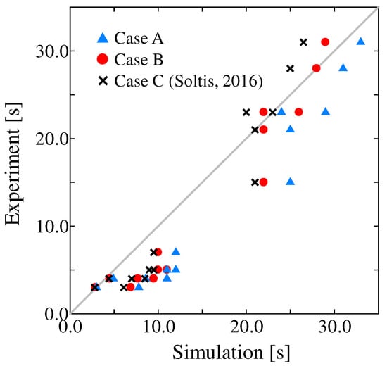 Comparison of ice crystal melting times between the experiments by Soltis [41] and present simulations. The diagonal line represents the complete correspondence between the experiments and present simulations.