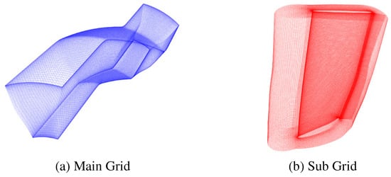 The computational grid system employed an overset grid composed of the main grid for the entire flow path and a sub-grid around the blade, as shown in Figure 4. This grid system was generated using an elliptical hyperbolic differential equation.