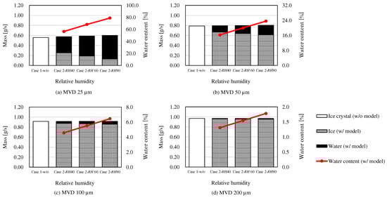 The impinging ice crystal mass and water content under the effect of relative humidity are shown in Figure 5 for different MVDs. Figure 5a shows the case for an MVD of 25 μm. Compared with Case 1-w/o (without the ice crystal model), the total mass of the impinging ice crystals (summation of water and ice masses) becomes slightly larger with increasing relative humidity. However, the larger particles of more than 100 μm show almost the same values against the relative humidity. This is due to the increase in the ratio of the surface area to the volume, resulting in the heat input becoming more diminutive than the unit volume. Moreover, as the relative humidity increases, the ice mass decreases, whereas the water content increases. This is because an increase in humidity corresponds to an increase in the heat of condensation from the vapor to the water film, resulting in a thickened water film. Figure 5b–d show the results for MVDs of 50–200 μm. The trends in relative humidity are similar to those for an MVD of 25 μm, but the water content significantly decreases in the case of larger ice crystals. Accordingly, in the icing simulation of an ice crystal, the relative humidity plays an important role in addition to MVD, especially for smaller MVD.
