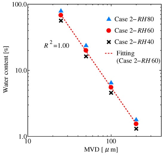 Water content variation with MVD for Case 2-, Case 2-, and Case 2-. Each plot represents the water content data in Figure 5. The fitting line represents the power-law approximation. is the decision coefficient for Case 2-.
