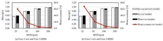 Total mass of the impinging ice crystal and water content on the blade under different MVD conditions at a relative humidity of 60%. The heat transfer coefficient h was evaluated by (Equation (5); white bar) for (a) and by (Equation (7); black and dotted bar) for (b). The bar chart represents the ice and water contents of the impinged ice crystal, where white bars are the results, not considering the state change and heat transfer, while the black and dotted bars represent the ice and water masses. The red dots on the red line represent the water content for the case with the heat transfer model.
