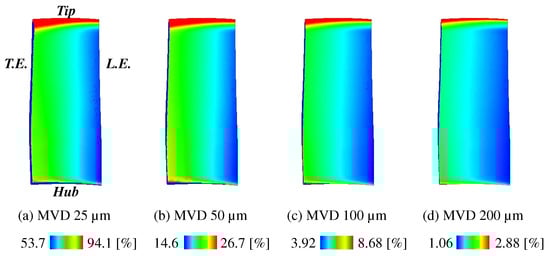 Figure 9a–d show the water content of the ice crystals by applying the state change model impinged with the pressure surface for MVDs of 25, 50, 100, and 200 μm in Case 2-. The minimum and maximum values for the color contour range were set individually within a 0–90% span of the rotor blades to visualize the water content distribution because the water contents near the tip (90–100% span) exceed 90% in all cases. Furthermore, the water content deviation between the leading and trailing edges at the mid-span increased as the ice crystal size decreased (see color contour range). This is because the flight time of the ice crystals before impinging on the rotor blade is longer for ice crystals colliding with the trailing edge; that is, the melting time of the ice crystals is longer. However, by comparing with the same chord position, the water contents on the leading edge of the tip side and the trailing edge of the hub side are higher. This is due to the long flight time of the ice crystal, as discussed later.