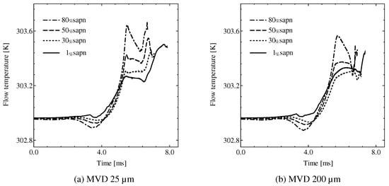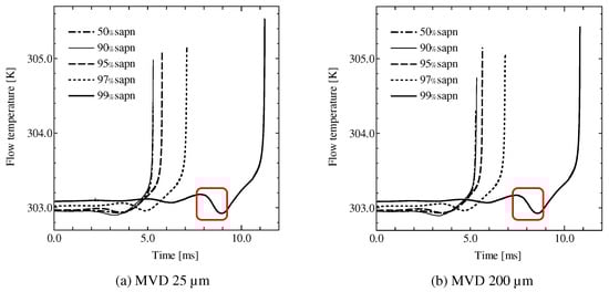 Figure 10a,b show the time histories of the static temperature of the flow field around the flying ice crystals injected in the 50–99% span with the state change model for MVDs of 25 and 200 μm in Case 2-. Here, we confirmed that the injection locations of the ice crystal were slightly different in the circumferential direction whereas the impinging locations on the blade were the same. In each case, the static temperature at the time of ice crystal injection was approximately 303 K, and there was no significant difference depending on the span position. The static temperature increased sharply immediately before impingement due to the influence of air around the stagnation point near the leading edge. Therefore, the flight time until the impingement dominantly affects the ice crystal content. In both cases, the static temperature of the ice crystal injected from the 99% span significantly fluctuated between and ms as pointed out by the red frame.