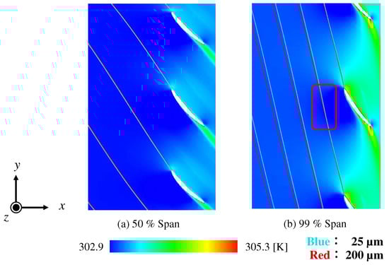 Figure 11a,b show the static temperatures of the flow field around the rotor blade and the ice crystal trajectories at MVDs of 25 μm (blue line) and 200 μm (red line) at the 50% and 99% spans, respectively. The ice crystal injected from the 99% span flowed near the suction surface, as shown by the red frame in Figure 11b; therefore, the static temperature decreased compared with that when injected from the 50% span. For the flight time until impingement, Figure 10 shows that ice crystals injected from the 99% span took 2.13 and 2.05 times longer than those injected from the 50% span for MVDs of 25 μm and 200 μm, respectively. Therefore, the increase in water content at the tip side shown in Figure 9 can be attributed to the longer flight time.
