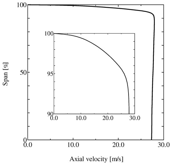 We discuss the cause of the change in flight time for ice crystals injected from the 99% span. Figure 12 shows the axial velocity distribution of the flow field at the position where the ice crystals are injected. The axial velocity of the 95% to 99% span was slower than the axial velocity of the mid-span because of the boundary layer near the casing of the axial fan. The axial velocity of the 99% span was times that of the mid-span, and the velocity in the circumferential direction was dominant in the flow field. When ice crystals were injected into the flow field, the initial velocity was set to be the same as the velocity of the flow field at the injection position, which increased the flying time of ice crystals through the 99% span. The same tendency was observed for other ice crystal sizes, and the higher water content on the tip side shown in Figure 9 was caused by the difference in the flight times of the ice crystals.