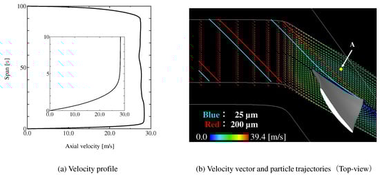 Figure 14a shows the axial velocity distribution of the flow field near the mid-chord of the rotor blade represented in Figure 14b, and Figure 14b shows the relative velocity vectors and ice crystal trajectories for the MVDs of 25 and 200 μm in the 1% span. Figure 14a indicates that the axial velocity of the 1% span is 0.489 times that of the mid-span due to the influence of the boundary layer formed around the rotor blade hub. This leads to the fact that the flying time of the ice crystals injected from the 1% span is slightly longer than that of ice crystals injected from other span positions. A comparison of the ice crystal trajectories is shown in Figure 14b for MVD 25 μm, where the trajectory change following the flow field can be observed near the rotor blade, while for MVD 200 μm, the trajectory is relatively straight near the blade. This is because an MVD of 25 μm gives a smaller Reynolds number than an MVD of 200 μm, as indicated by Equation (11), and the drag coefficient increases, which strongly affects the ice crystal trajectories. Ice crystals injected from the 1% span are affected by the boundary layer only when they pass near the hub side of the rotor blade. Therefore, the increases in flight time and water content are smaller than those of ice crystals impinging on the tip side.