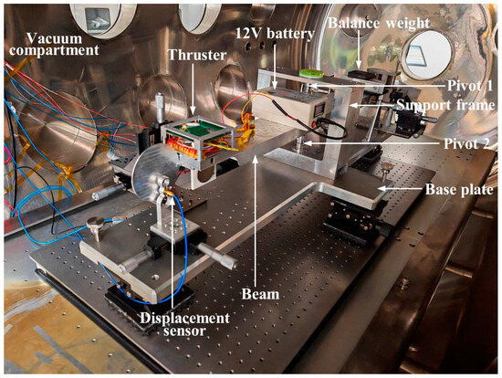 Similarly, under the assumption of small angles, the relationship between the line displacement P can be obtained from a line displacement measurement point with a distance of l from the axis of rotation, and the deflection angle is . Therefore, based on the calibration results of the torsion pendulum parameters, the magnitude of the measured thrust can be calculated by measuring the swing line displacement at a certain measuring point on the torsion pendulum (l set to 0.5 m).