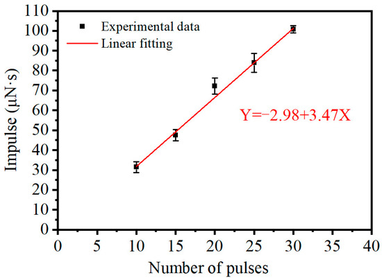 In order to verify the accuracy and repeatability of the thruster impulse, the total impulse under different pulse numbers is measured. The total impulse of the thruster changes with the number of pulses, as shown in Figure 5. The pulse width of the laser is set to 900 μs. As the number of laser pulses increases from 10 to 30, the total impulse increases from 31.44 μN·s to 100.74 μN·s. Through linear fitting, it can be seen that the total impulse is approximately linear with the change in the number of pulses.