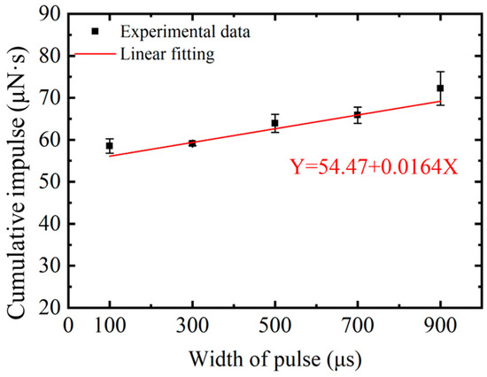 The pulse width of the laser has great influence on the performance of the thruster. The total impulse of the thruster varies with the pulse width of the laser, as shown in Figure 6, where the number of pulses is set to 20. It can be seen that as the laser pulse width increases from 100 μs to 900 μs, the total impulse increases approximately linearly from 58.52 μN·s to 72.24 μN·s.