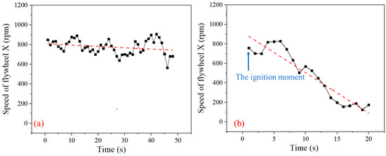 Presents the rotational speed of the satellite flywheels: speeds of flywheels along the x axis when the thruster was (a) off and (b) on. The black square in figure represents the speeds of flywheels along the x axis. The red dotted line represents the fitting line of the X-axis to the flywheel speed.