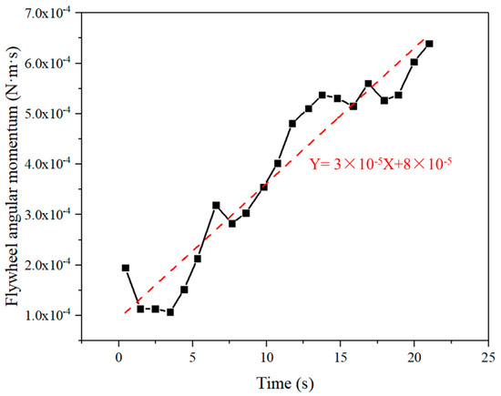 Figure 8 shows the rotational speeds of the x-axis flywheels. Figure 8a shows the rotational speeds of the flywheels when SLP-1K was not operating, and Figure 8b shows the speeds of the flywheels after SLP-1K was turned on. From the two graphs, it can be found that when the thruster was off, there were some oscillation changes in the flywheel speed, and the slope change in its average value is slight. The reason for the slight change is perhaps attributed to the spatial disturbance moments. When the thruster was turned on, the rotational speeds of the flywheels changed significantly, indicating a significant effect of the thruster. The total angular momentum of the system can be further obtained according to the speed of the flywheel, as shown in Figure 9. The thrust outputs were calculated based on the fitting coefficients. The x-axis thrust was about 315 μN. From the experimental results, it can be seen that the average thrust of the laser micro-thruster on orbits was higher than that of the ground experiments. The possible reason is the additional torque produced by the thruster. When the laser thruster is working, the rotations of the driving wheel and the driven one, which are used in the propellant feed system, bring some additional torques. Those torques will increase the attitude changes besides the net thrust produced by the thruster, eventually leading to a larger on-orbit thrust. However, in the ground test, the torsion pendulum system was used to measure the thrust perpendicular to the nozzle direction of the thruster, so the rotation torques in the thruster did not affect its thrust value. Therefore, the on-orbit thrust is higher than the ground one.