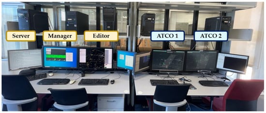 The simulation platform was completed by three additional positions used to manage the simulations. The first was the server, which was used to record the simulation data and configure the sectorisation assigned to the control positions. The second was the manager, which was used to manage the activation and deactivation of the other positions. The editor was the position used to design the exercises and then to start and stop the simulations. In the case of this position, special software called Radar Operation Simulator & Editor (ROSE), marketed by the company of the same name, was used. Additionally, to record the EEG data, each of the headsets worn by the participants had to be connected to a different computer for data recording. The EMOTIVPRO software was used for this purpose. The two computers used to record the EEG data were the server and the manager, as they were the least used once the simulation had started.