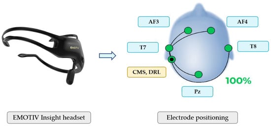 EEG equipment used in the study: EMOTIV Insight 5-channel headset (left) and electrode positioning on the scalp (right).