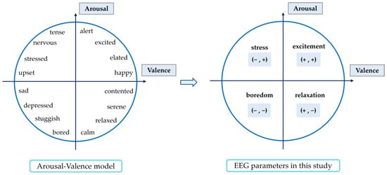 The first four EEG parameters are derived from a simplification of Russell’s two-dimensional model for classifying emotions. The valence and arousal axes define four quadrants, and each of the parameters is chosen to be representative of one quadrant.