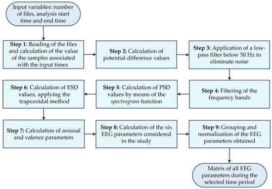 Once the parameters had been selected, it was time to move on to the second stage of the methodology. This stage consisted of programming the software to automate the calculation of the parameters. As will be explained in later sections, the software was programmed in MATLAB. The software was developed in such a way that the user only needs to enter the data to be analysed and select the minutes of the recording where to start and end the analysis. Then, the software automatically calculates the six EEG parameters for the different minutes of the simulation.