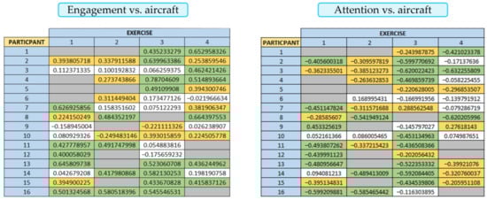 This has been concluded in the case of linear correlations and is confirmed by the application of the ANOVA test. In the case of the correlations, these parameters are the ones for which a higher Pearson correlation coefficient was obtained. Furthermore, they were the only ones that were below the p-value threshold of 0.05 to obtain statistically significant results in the ANOVA test. The interpretation of these results is that, if there is a change in the value of the taskload or in the number of simultaneous aircraft in the sector, the engagement and attention parameters also change.