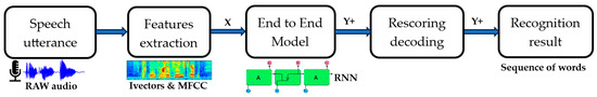 For optimization purposes and simplification of the training process of different models, new end-to-end models are deployed for ASR [25]. It typically uses a type of neural network called deep neural network (DNN) or recurrent neural network (RNN) architecture. It is trained on large amounts of audio data with corresponding transcriptions. It has been proven effective at transcription in many cases, especially in a noisy environment, and can potentially simplify the ASR pipeline. The end-to-end model can directly decode a feature-extracted X from spoken utterance to a sequence of words Y+ by integrating the acoustic and the language model in one process, as shown in Figure 2; it is most often used in a reduced and noisy dataset. Moreover, there is a possibility of including an optional language model called a scorer to perform the best results.
