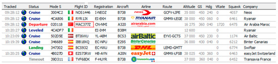 The voice recording was obtained with Voice Activity Detection (VAD) [33] at a rate of 16 kHz from the VHF receiver [34] tuned to the airport frequency connected to the workstation’s audio input. At the same time, the ADS-B receiver provided by AirNav System [35] logs flight data, as shown in Figure 4, including the call sign code of activated aircraft with approximately 200 Nm circumference. In addition, a weather report is saved separately after downloading updated data from the US National Weather Service (NWS) Server.