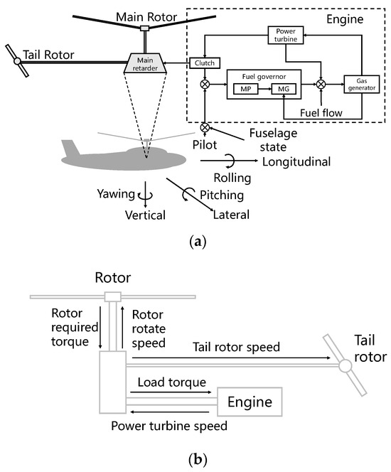 Schematic illustration of the helicopter–engine coupling relationship: (a) coupling between the helicopter and engine [17]; (b) torque/rotate speed coupling between the rotor, tail rotor, and engine.