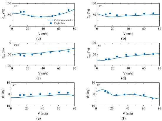 Trimmed characteristics of helicopter: (a) collective pitch stick; (b) lateral cyclic stick; (c) longitudinal cyclic stick; (d) pedal position; (e) roll angle; (f) pitch angle.