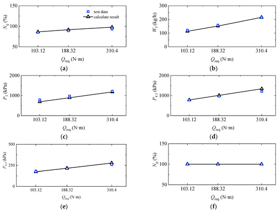 Trimmed characteristics of turboshaft engine: (a) gas generator speed; (b) power turbine speed; (c) fuel flow; (d) compressor inlet pressure; (e) gas turbine inlet pressure; (f) power turbine inlet pressure.