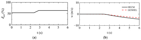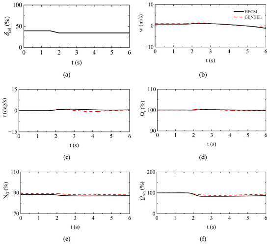 Furthermore, the dynamic response of the HECM is validated using the Sikorsky general helicopter (GENHEL) model [39,40], which has good credibility and has been implemented in the famous NASA’s Ames Research Center. The transient step response characteristics of UH-60A in hover and 60 knots forward flight are calculated. As depicted in Figure 6 and Figure 7, a comparison of the dynamic response results of HECM and the GENHEL model reveals similarities in vertical speed, heading speed responses, and the behaviors of main rotor required torque, rotor speed, and gas generator speed. Consequently, we conclude that the HECM model established in this study exhibits reliability and is suitable for subsequent simulations and handling quality assessment.