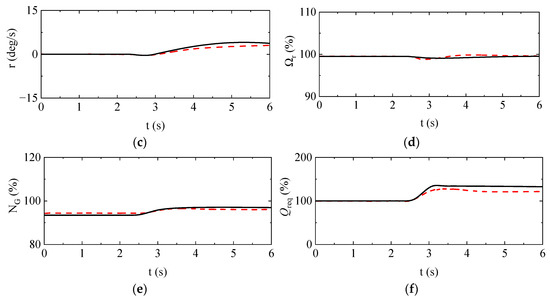 Transient step response characteristics of the helicopter in forward flight (60 knots): (a) control signal; (b) vertical speed; (c) yaw rate; (d) main rotor speed; (e) engine gas generator speed; (f) helicopter required torque.