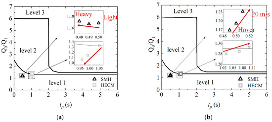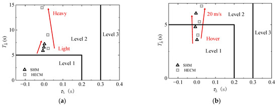Based on LSQ calculation results in Table 2, we can figure out the altitude HQR for all conditions. As depicted in Figure 13, the lag in engine output significantly reduces the handling quality Level of the helicopter’s altitude response characteristics. With an increase in helicopter weight, the influence of the engine results in the helicopter’s altitude response HQR transitioning from Level 1 to Level 2. The engine’s output lag leads to a decrease in the helicopter’s altitude response fitting function coefficient from 0.028 to −0.013, and to increasing from 0.463 s to 7.24 s. Conversely, as the helicopter’s forward flight speed increases, the impact caused by the engine decreases from Level 2 to Level 1. The engine impact reduces the helicopter response fitting function coefficient from 0.030 to 0.005, and from 6.75 to 4.03 s. Therefore, it can be concluded that the adverse effect of engine dynamic response on the handling quality of helicopter altitude characteristics intensifies with the increase in flight weight and decreases with the rise of forward flight speed.