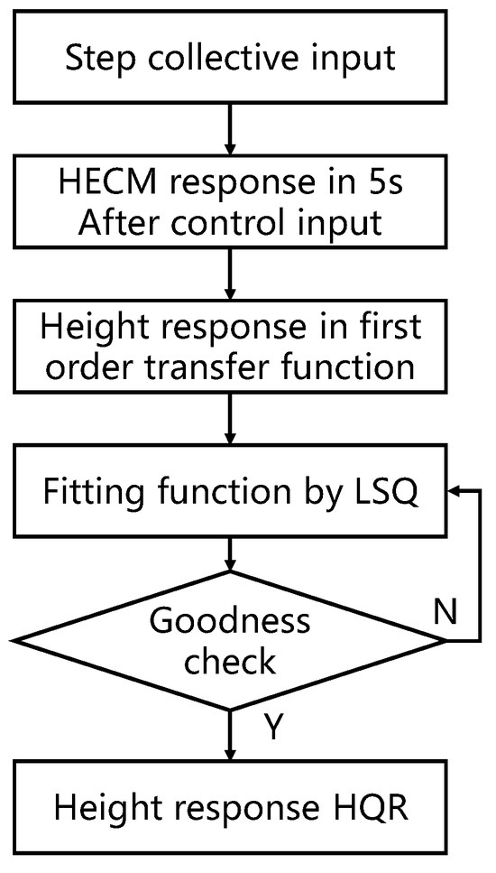 The procedure for calculating the altitude response handling quality, as outlined in the ADS-33E-PRF criteria, is detailed in Figure 11. It specifies that pitch, roll, and heading excursions remain essentially constant during this evaluation. Moreover, the vertical velocity response must exhibit a qualitative first-order shape for at least 5 s following a step collective input. The equivalent first-order transfer function of vertical rate to the collective stick input is defined as follows: